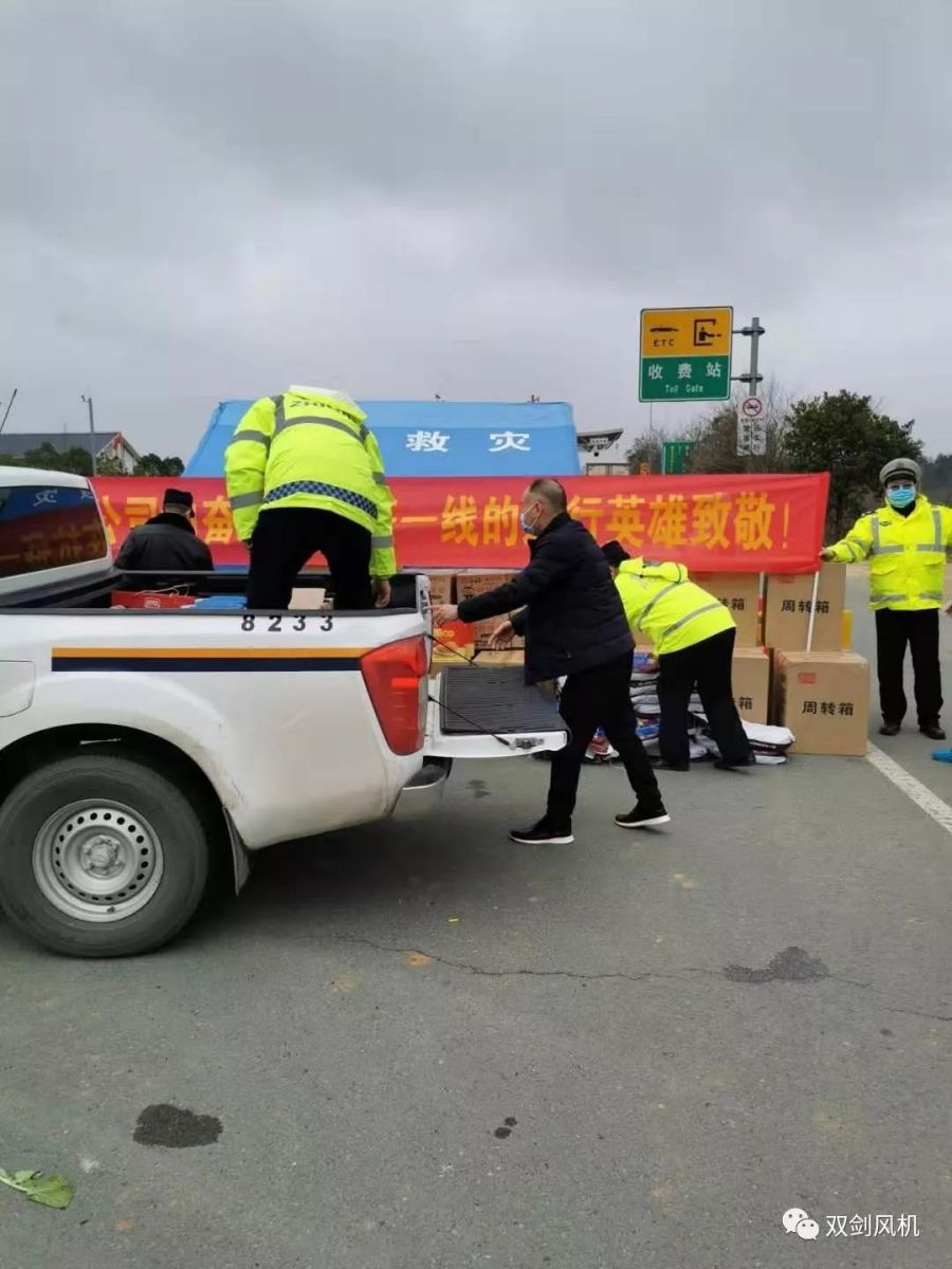 2月11日下午14時(shí),雙劍風(fēng)機(jī)將一批84消毒液、酒精、殺菌洗衣粉、方便面、礦泉水、面包等物資送到麻竹高速?gòu)V水收費(fèi)站附近交警執(zhí)勤點(diǎn),向堅(jiān)守崗位的廣大干警表示慰問(wèn)。