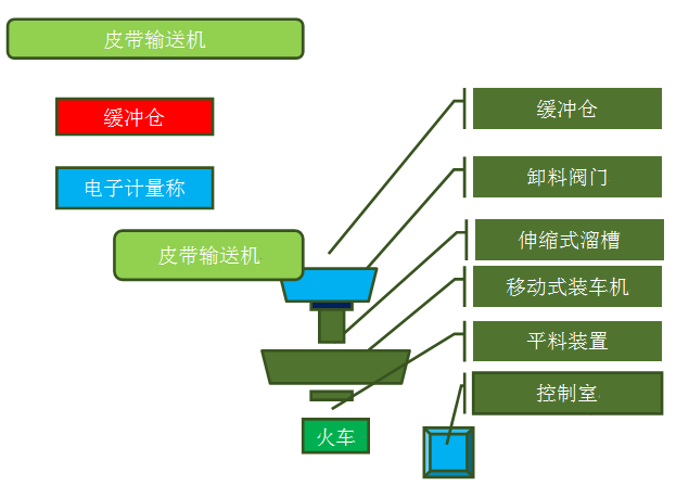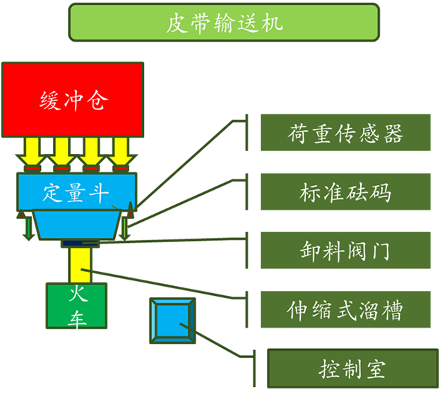 該快速定量裝車系統(tǒng)采用快速計量系統(tǒng)和移動裝車系統(tǒng)相結合,計量系統(tǒng)采用靜態(tài)計量,精度大于5‰。該系統(tǒng)主要由輸送系統(tǒng)、計量裝車系統(tǒng)(布料機構、緩沖料倉、漏斗型定量倉、稱重系統(tǒng)、鄂式配料閘門、平板閘門)、軌道移動式裝車裝置(平倉系統(tǒng))、控制系統(tǒng)、除塵系統(tǒng)等。 |