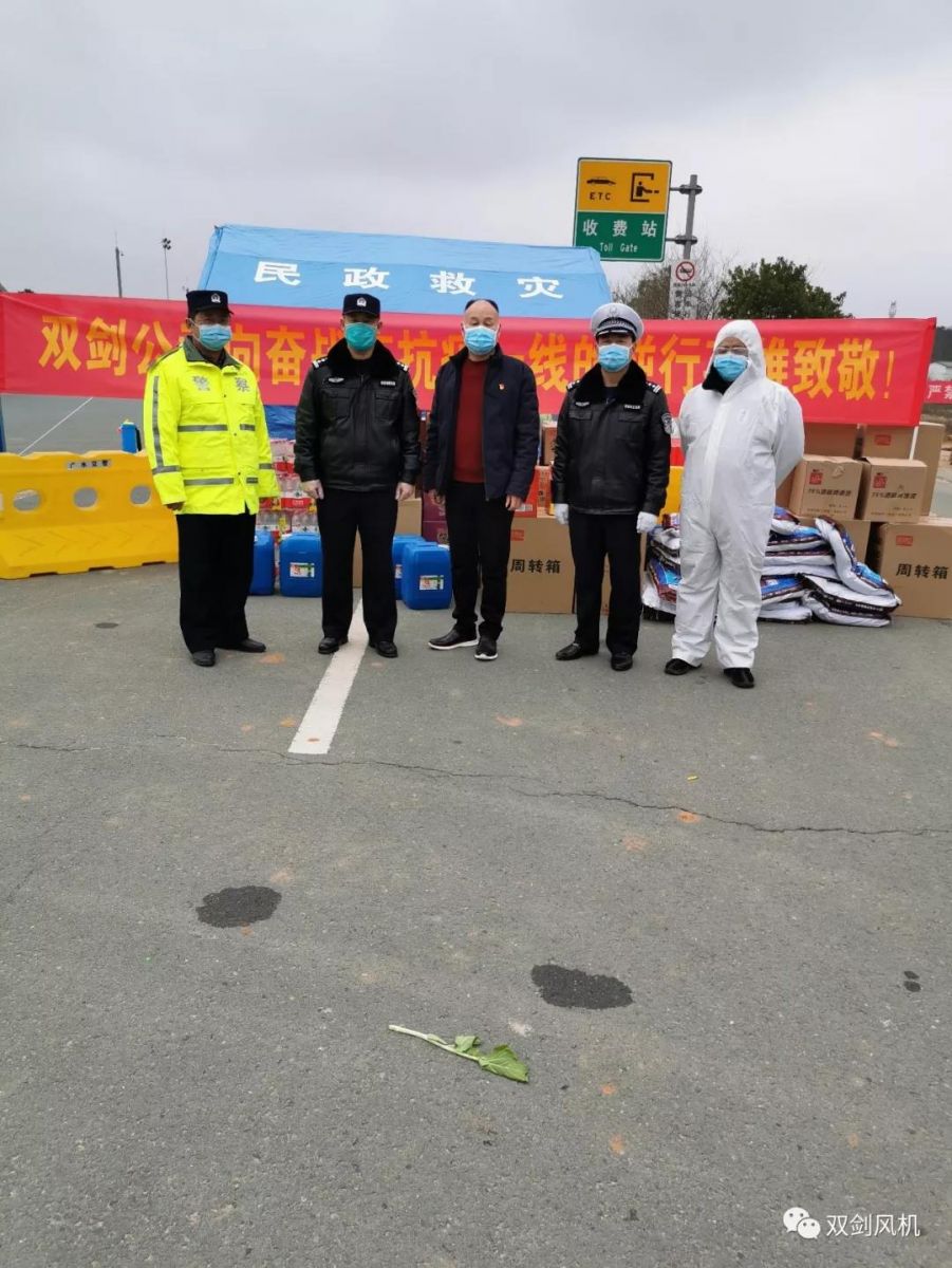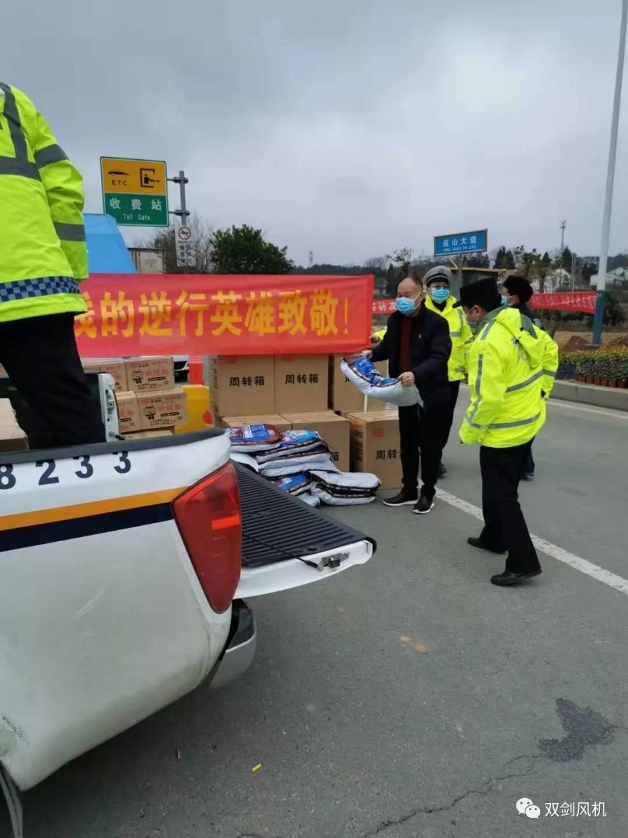 2月11日下午14時(shí),雙劍風(fēng)機(jī)將一批84消毒液、酒精、殺菌洗衣粉、方便面、礦泉水、面包等物資送到麻竹高速?gòu)V水收費(fèi)站附近交警執(zhí)勤點(diǎn),向堅(jiān)守崗位的廣大干警表示慰問(wèn)。